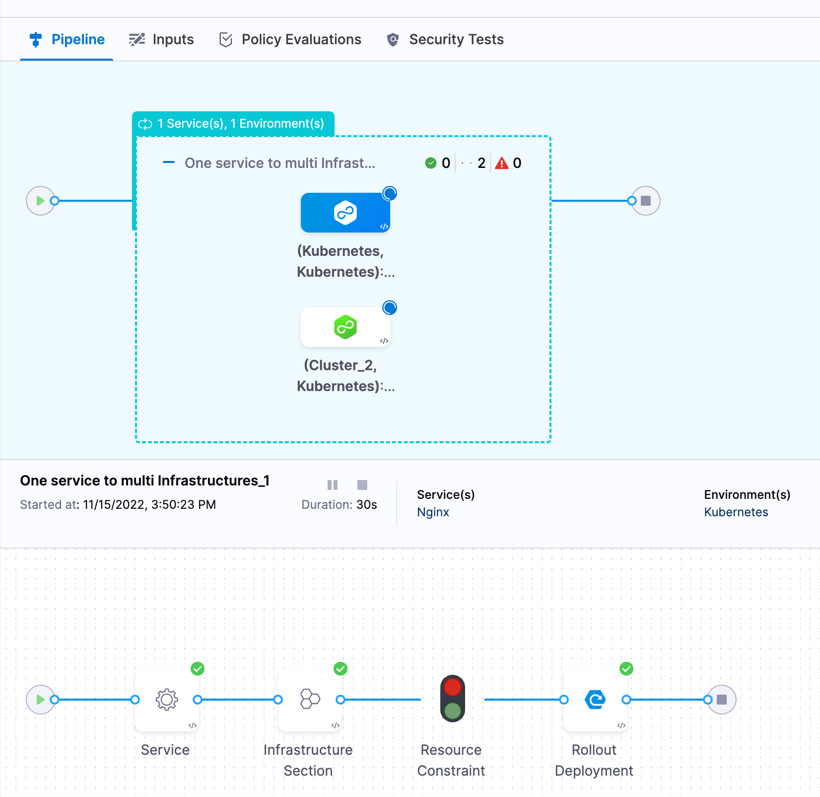 <+pipeline.stages.sampleStage.variables.resourceNamePrefix>, for multi environment, expression path changes and gets updated based on the iteration number of stage like this,<+pipeline.stages.sampleStage_1.variables.resourceNamePrefix>. - Runtime inputs for service overrides are not supported when using multi-service configuration.