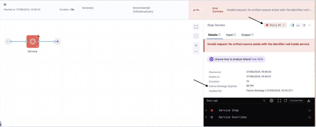 This pipeline YAML demonstrates a service step that references an invalid artifact (primaryArtifactRef). As a result, the step will fail. The failure strategy is configured to retry the step twice, waiting 10 seconds between retries. If the issue persists, the pipeline will be marked as failed.