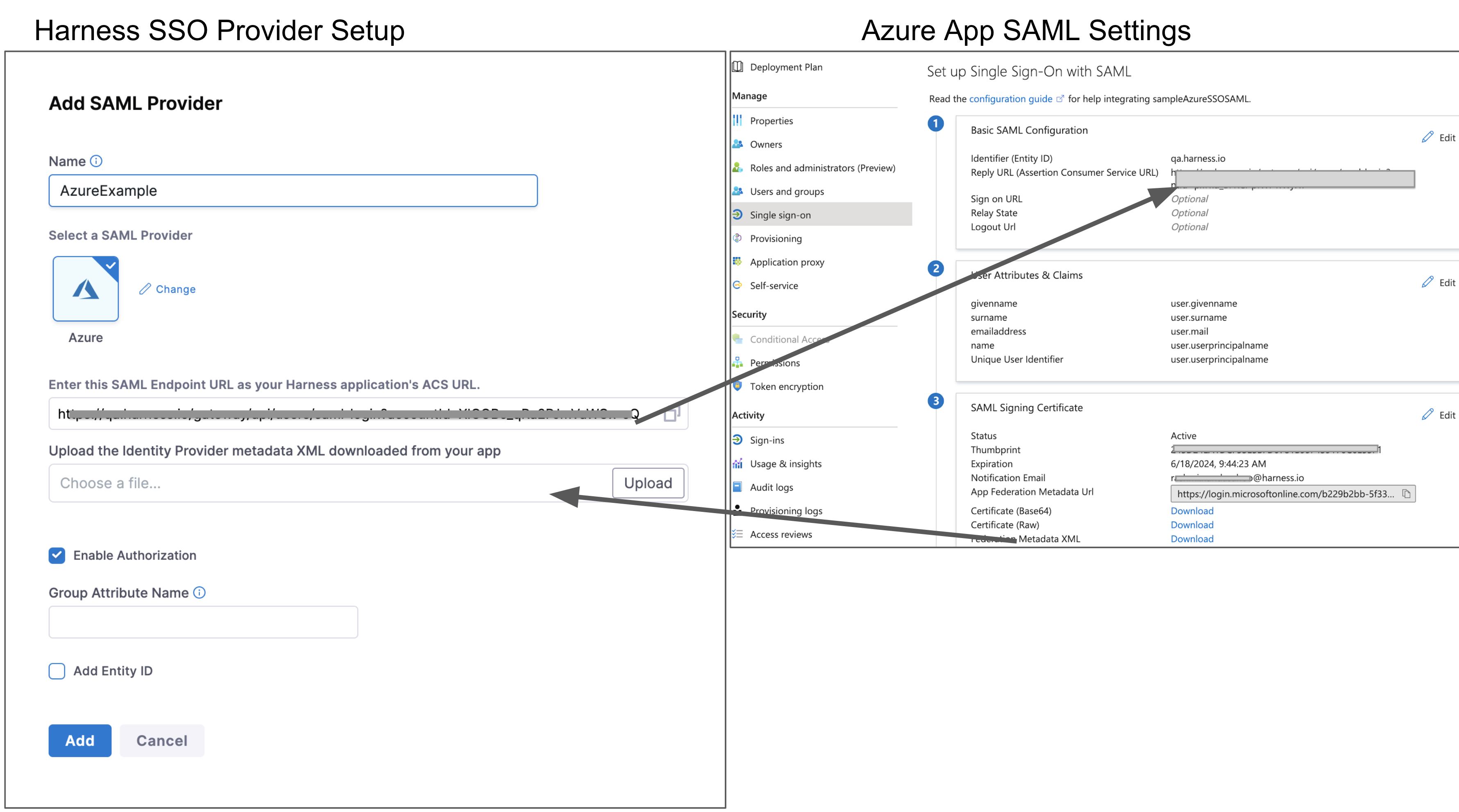 - SAML metadata file: This file is provided by your SAML provider app. You upload this file into the Harness Single Sign-On (SSO) Provider dialog to integrate the app with Harness.