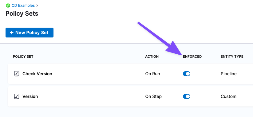 By default, a new Harness Policy Set is disabled. This default prevents someone from enforcing a Policy Set and accidentally impacting Pipelines and other Harness resources.